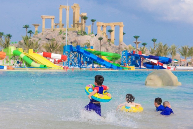 Đến với khu vui chơi dưới nước, các cư dân nhí thỏa sức vui đùa trong tổ hợp công viên quy mô tới 18ha bao gồm Tổ hợp biển tạo sóng lớn nhất thế giới, hồ nước mặn Laguna lớn hàng đầu châu Á, công viên cát Sandy Park, sân chơi nước Aqua và Blue Ocean, vịnh trượt nước sắc màu… Tại đây, các em có thể trải nghiệm những trò chơi đầy sáng tạo như xúc cát tạo nên những kỳ quan của riêng mình, tự trang trí mũ lưỡi trai cho mình và bố mẹ bằng các nét vẽ nhiều màu sắc...