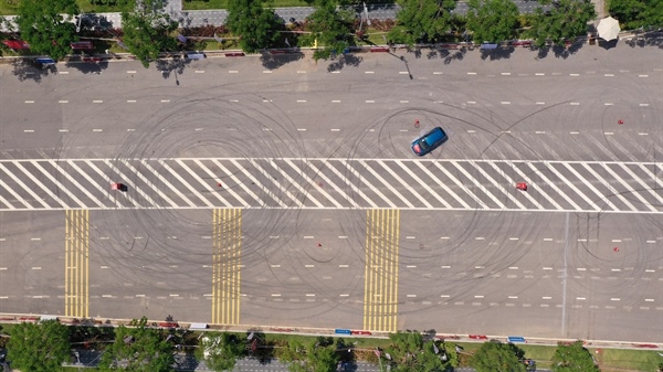 Một pha bẻ ngoặt gần như 360 độ đòi hỏi khả năng bám đường cũng như sự cân bằng cực tốt của xe đua. Âm thanh lốp xe vào cua cùng tiếng phanh khiến người xem phải nín thở vì hồi hộp. Tay đua vô địch Phạm Hoàng Đức chia sẻ về cảm giác “đánh lái không sợ chao hay lật” với VF e34. Điểm mạnh này theo anhmột phần nhờ kết cấu pin tấm pin lớn đặt ở trung tâm tạo độ ổn định cho xe.