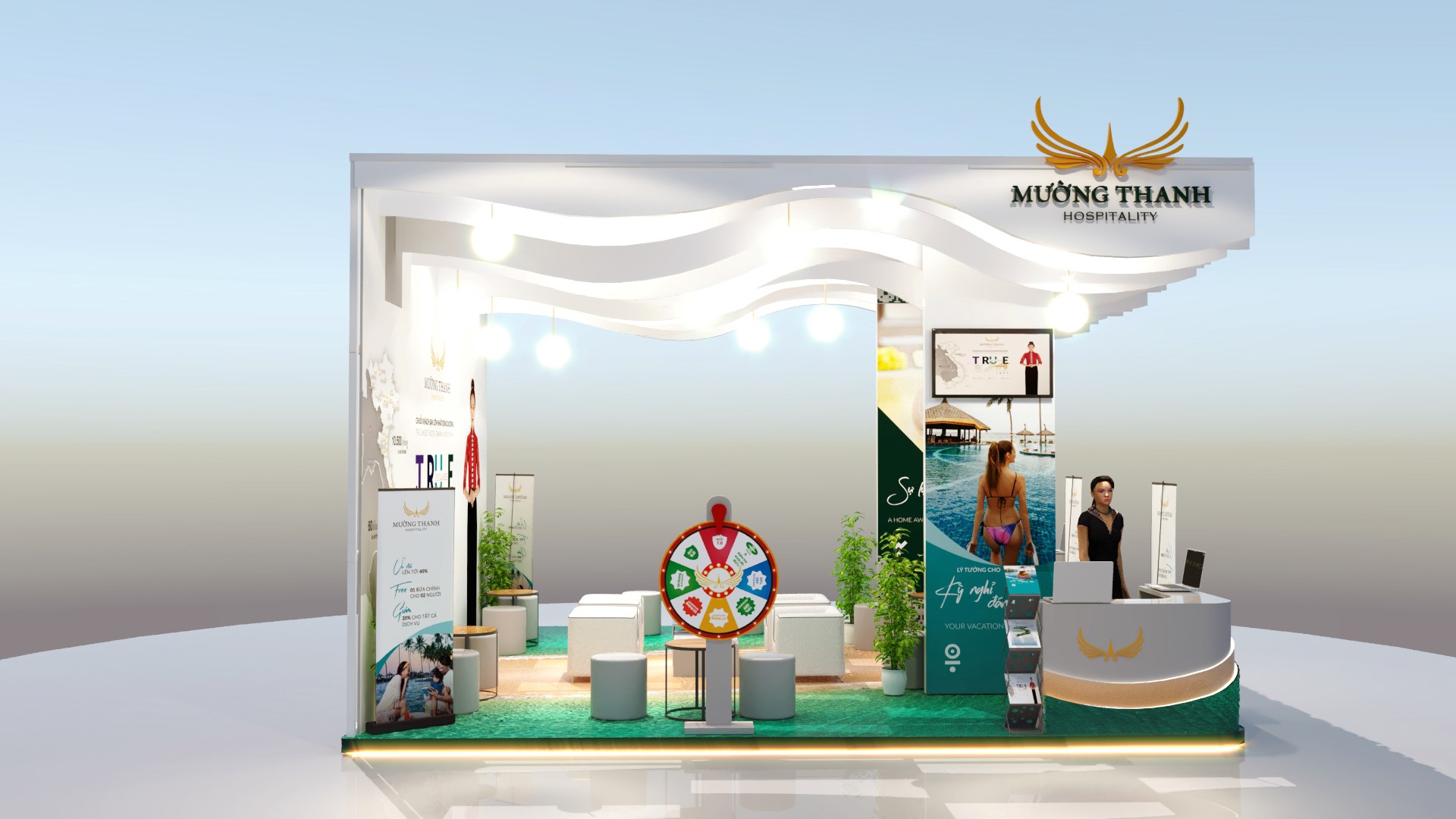 Đến với Hội chợ du lịch quốc tế VITM 2019, gian hàng năm nay của Mường Thanh được đầu tư với sự chuẩn bị kỳ công. Bám sát theo chủ đề của Hội chợ hướng về du lịch xanh và từ ý tưởng tái hiện một thiên đường mùa hè trong xanh, gian hàng Mường Thanh có mái vòm màu trắng xếp lớp uốn cong mềm mại như những đợt sóng biển và phần nền mang màu xanh đại dương mênh mang, xen giữa là lớp cát. Sử dụng những tông màu thanh mát và cách tạo hình sáng tạo, khách hàng có trải nghiệm như đang đứng giữa một bãi biển thu nhỏ khi ghé gian hàng của Mường Thanh.