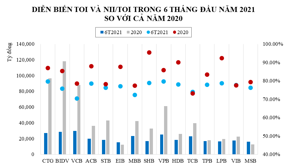 Trong các ngân hàng TMCP có vốn Nhà nước, VietinBank có mức độ chuyển dịch tỷ lệ NII/TOI khá rõ khi tỷ lệ này giảm từ mức 86,9% trong năm 2020 xuống mức 79,7% trong 6 tháng đầu năm 2021. Đối với nhóm ngân hàng TMCP tư nhân, sự chuyển dịch diễn ra mạnh ở ACB, Liên Việt Post Bank, SHB…khi liên tục tăng tỷ trọng thu nhập ngoài lãi, đặc biệt là thu nhập từ hoạt động dịch vụ.