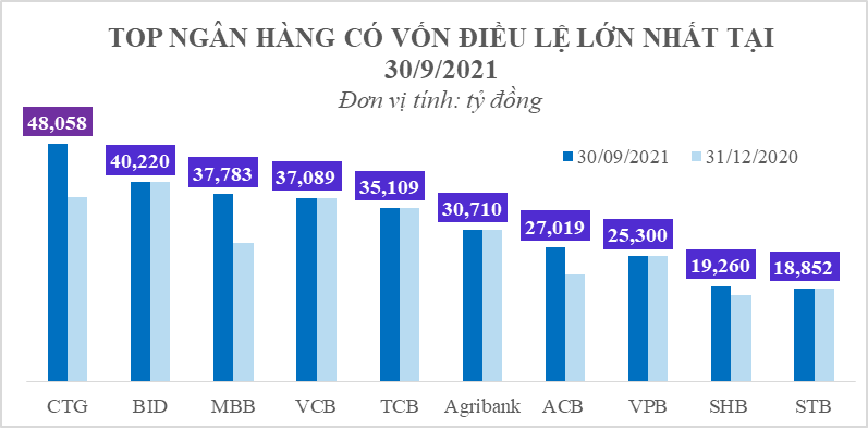 Năm 2021 là năm của những “cuộc đua” về tăng vốn giữa các ngân hàng. Đây cũng là nhu cầu thường trực của các ngân hàng khi vốn chủ sở hữu đa phần còn mỏng hoặc cần gia cố thêm để nâng cao khẩu vị an toàn vốn. Từ đầu năm đến nay, 19 ngân hàng liên tục đẩy mạnh tăng vốn bằng nhiều hình thức và đã nhận được sự chấp thuận chính thức về tăng vốn điều lệ của Ngân hàng Nhà nước (NHNN), bao gồm các ngân hàng có vốn Nhà nước như Vietcombank, VietinBank, BIDV; các ngân hàng thuộc khối tư nhân gồm SHB, VP Bank, TP Bank, OCB... Tính đến thời điểm 30/06/2021, VietinBank là ngân hàng dẫn đầu về vốn điều lệ với 48.058 tỷ đồng.