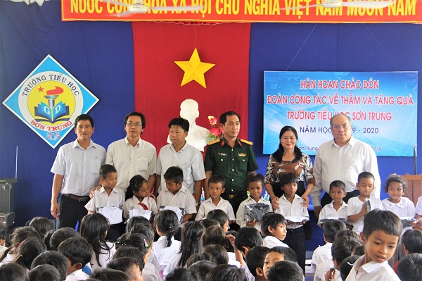 Tại đây đoàn đã ân cần thăm hỏi, chúc sức khỏe và trao tặng các phần quà cho tập thể giáo viên, học sinh trường tiểu học Sơn Trung và trường mầm non Hoàng Oanh. Các phần quà gồm 300 bộ sách tiếng Anh, 1.650 vở các loại, 490 bộ đồng phục học sinh cùng các loại đồ dùng học tập và trang thiết bị nhà bếp, 1 dàn máy vi tính để bàn, 1 tủ lạnh, 1 ti vi 50 inches và một số vật dụng sinh hoạt khác…
