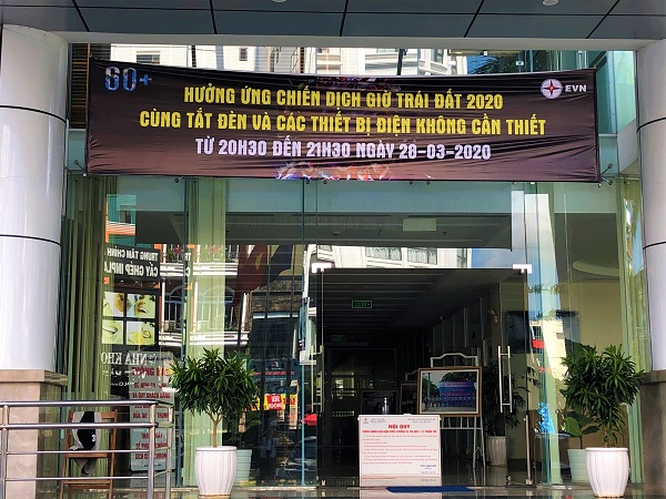 Treo băng rôn ”Hưởng ứng chiến dịch Giờ Tráo đất 2020, cùng tắt đèn và các thiết bị không cần thiết” trước trụ sở PC Khánh Hòa