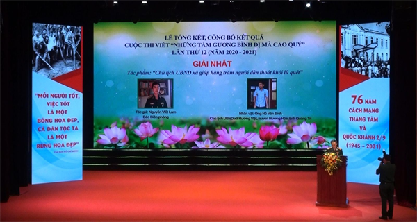 Lễ tổng kết, công bố kết quả Cuộc thi viết “Những tấm gương bình dị mà cao quý” lần thứ 12 năm 2020 - 2021; phát động Cuộc thi viết lần thứ 13 Và Chương trình nghệ thuật “Tiếng hát dâng Người” đã khép lại với những dấu ấn thành công. Khởi nguồn từ năm 2008, cuộc thi viết “Những tấm gương bình dị mà cao quý” năm thứ 12 (2020-2021), năm 2020-2021 do Báo Quân đội nhân dân (QĐND) phối hợp với Vụ Báo chí-Xuất bản, Ban Tuyên giáo Trung ương; Nhà xuất bản QĐND diễn ra trong bối cảnh đất nước bước vào những năm tháng có tính chất lịch sử gắn với những sự kiện quan trọng như Đại hội Đảng lần thứ XIII, bầu cử Đại biểu Quốc hội và HĐND các cấp nhưng cũng là năm của nhiều khó khăn mang tính lịch sử, năm với nhiều thử thách bản lĩnh, ý chí của con người Việt Nam.