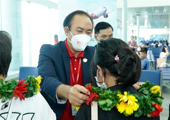 Phó Tổng giám đốc Vietjet Tô Việt Thắng tặng hoa chào đón du khách trên chuyến bay đầu tiên từ TP.HCM trở lại với Phuket