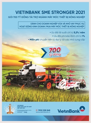 VHO- Tiếp tục gia tăng những ưu đãi, sản phẩm, chương trình hữu ích từ Gói ưu đãi toàn diện VietinBank SME Stronger 2021 dành cho khách hàng doanh nghiệp vừa và nhỏ (KHDN VVN), đồng thời hiện thực hóa chủ trương của Đảng, Chính phủ về công nghiệp hóa, hiện đại hóa nông nghiệp, nông thôn, VietinBank triển khai ưu đãi kinh doanh máy móc,thiết bị nông nghiệp với tổng trị giá tài trợ lên đến 700 tỷ đồng.