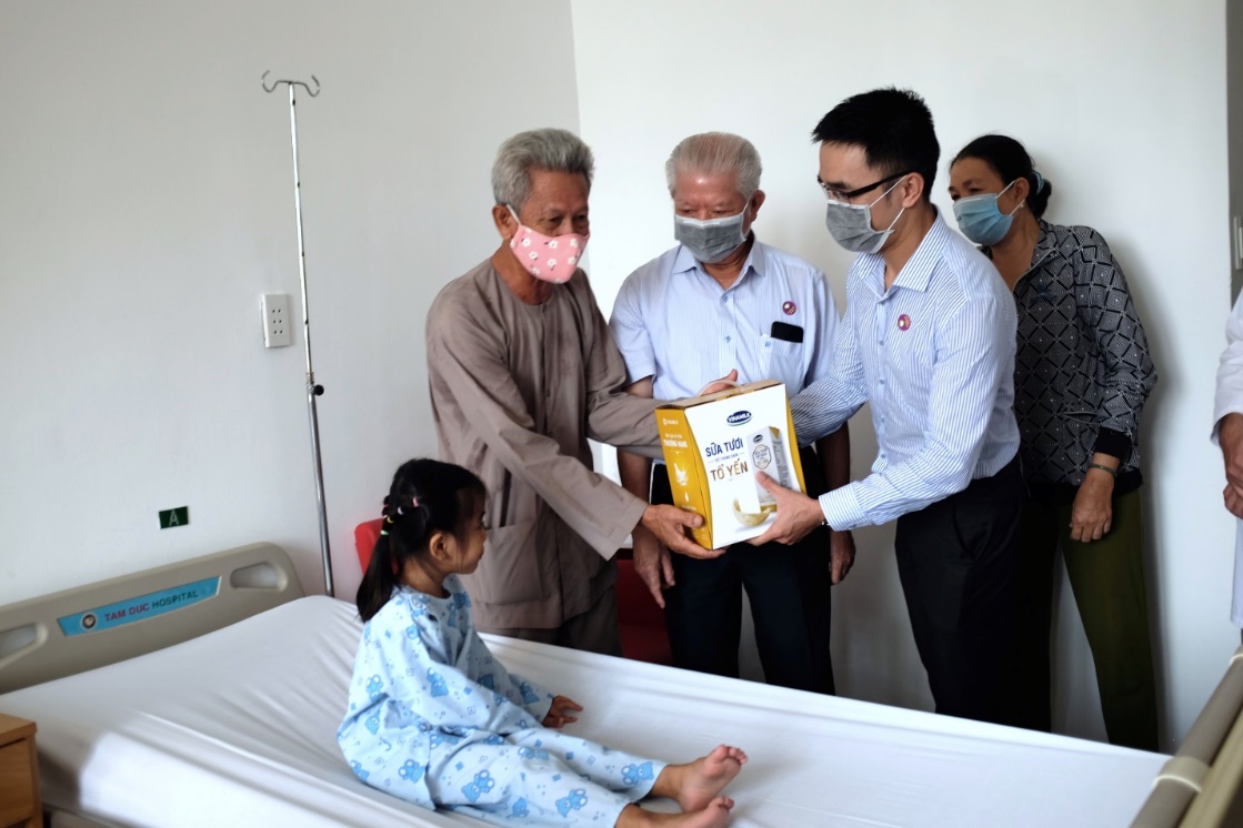 Nhân dịp này, đại diện Công ty Vinamilk và Hội Bảo trợ bệnh nhân nghèo TP. HCM đã đến thăm bé Nguyễn Ngọc Bảo Trân, sinh năm 2016 vừa hoàn thành ca phẫu thuật tim Tứ Chứng Fallot tại Bệnh viện tim Tâm Đức. Trông nom em trong suốt thời gian nhập viện là ông bà nội vì ba mẹ em vừa đi làm thuê tại Châu Đốc, An Giang vừa phải chăm sóc con út mới được 4 tuổi.