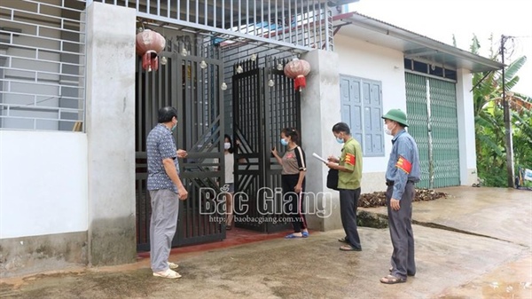 Tổ Covid cộng đồng thôn Chuông Vàng, xã Tân Hưng (Lạng Giang) tuyên truyền, giám sát công tác phòng, chống dịch của từng hộ dân. Ảnh tư liệu: Báo Bắc Giang