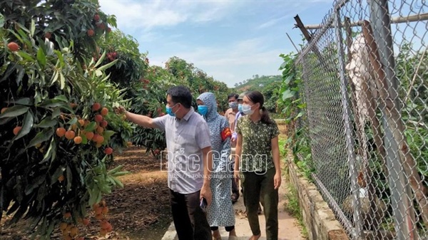 Tổ Covid cộng đồng thôn Trung Phong, xã Tân Lập (Lục Ngạn) kiểm tra vườn vải thiều của một gia đình đang bị cách ly tập trung để bố trí lực lượng tham gia thu hoạch giúp gia đình. Ảnh tư liệu: Báo Bắc Giang