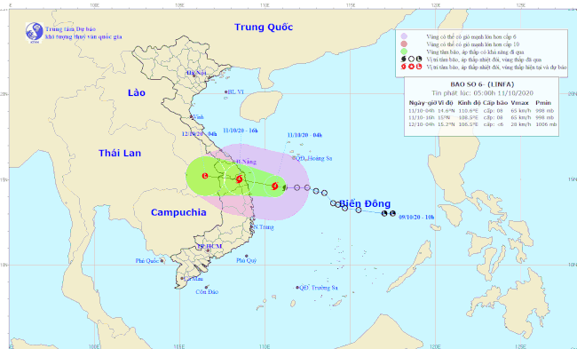 Theo Trung tâm Dự báo khí tượng thủy văn quốc gia, áp thấp nhiệt đới (ATNĐ) đã mạnh lên, trở thành cơn bão số 6 trong năm nay ở Biển Đông. Dự báo trong 12 giờ tới, bão số 6 di chuyển theo hướng Tây, mỗi giờ đi được khoảng 20 km, đi vào đất liền các tỉnh từ Quảng Nam đến Bình Định. Trong 12 đến 24 giờ, bão số 6 tiếp theo bão di chuyển theo hướng Tây, mỗi giờ đi được 15-20 km, suy yếu thành áp thấp nhiệt đới, sau đó là một vùng áp thấp. Đến 4 giờ ngày 12-10, vị trí trung tâm vùng áp thấp ở vào khoảng 15,2 độ Vĩ Bắc; 106,5 độ Kinh Đông, trên đất liền phía Nam Lào.
