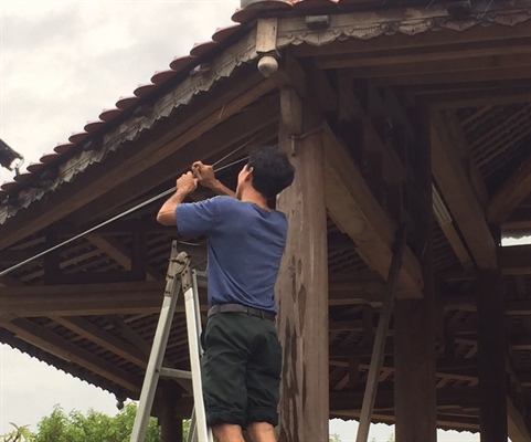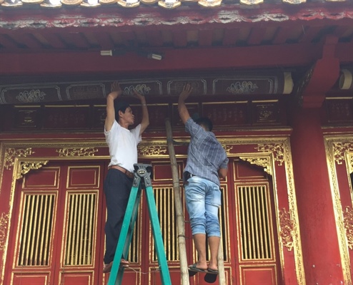 Cán bộ Trung tâm Bảo tồn Di tích Cố đô Huế thực hiện các biện pháp chống đỡ tại di tích Thế Tổ Miếu trước bão số 5. Ảnh: Dương Ngọc Minh