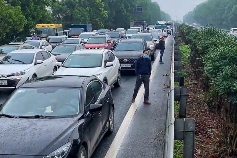 Dòng phương tiện ùn ứ khoảng 5km hướng đi Hà Nội do tai nạn giao thông gần nút giao Cầu Giẽ. Ảnh: TH