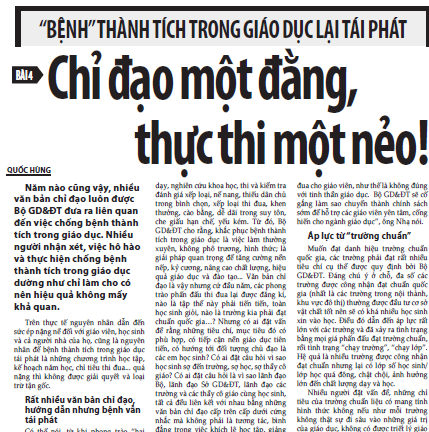 Chúng tôi cũng xin lấy những lời tâm huyết của nhà văn để kết thúc loạt bài này: “Bộ GD&ĐT cần chữa chạy khẩn trương bệnh thành tích, phô trương. Cần tổng kết, đánh giá lại các phong trào thi đua, các tiêu chuẩn thi đua, sao cho thiết thực, hiệu quả. Tránh đề ra quá nhiều thứ danh hiệu viển vông, khiến đội ngũ giáo viên, các trường phải gồng mình lên “thi đua” mà không đem lại điều bổ ích nào cho xã hội, trái lại phải tìm mọi cách gò ép, kể cả dối trá, để không bị “tụt hậu”. Biết rằng, những căn bệnh của ngành GD&ĐT đã xảy ra từ trước đó rất lâu, nhưng dù sao lãnh đạo ngành vẫn phải chịu trách nhiệm và đặc biệt là phải nhận thức rõ tình hình của ngành, trách nhiệm của bản thân, để hoàn thành sứ mệnh cao cả mà nhân dân đã giao phó”.