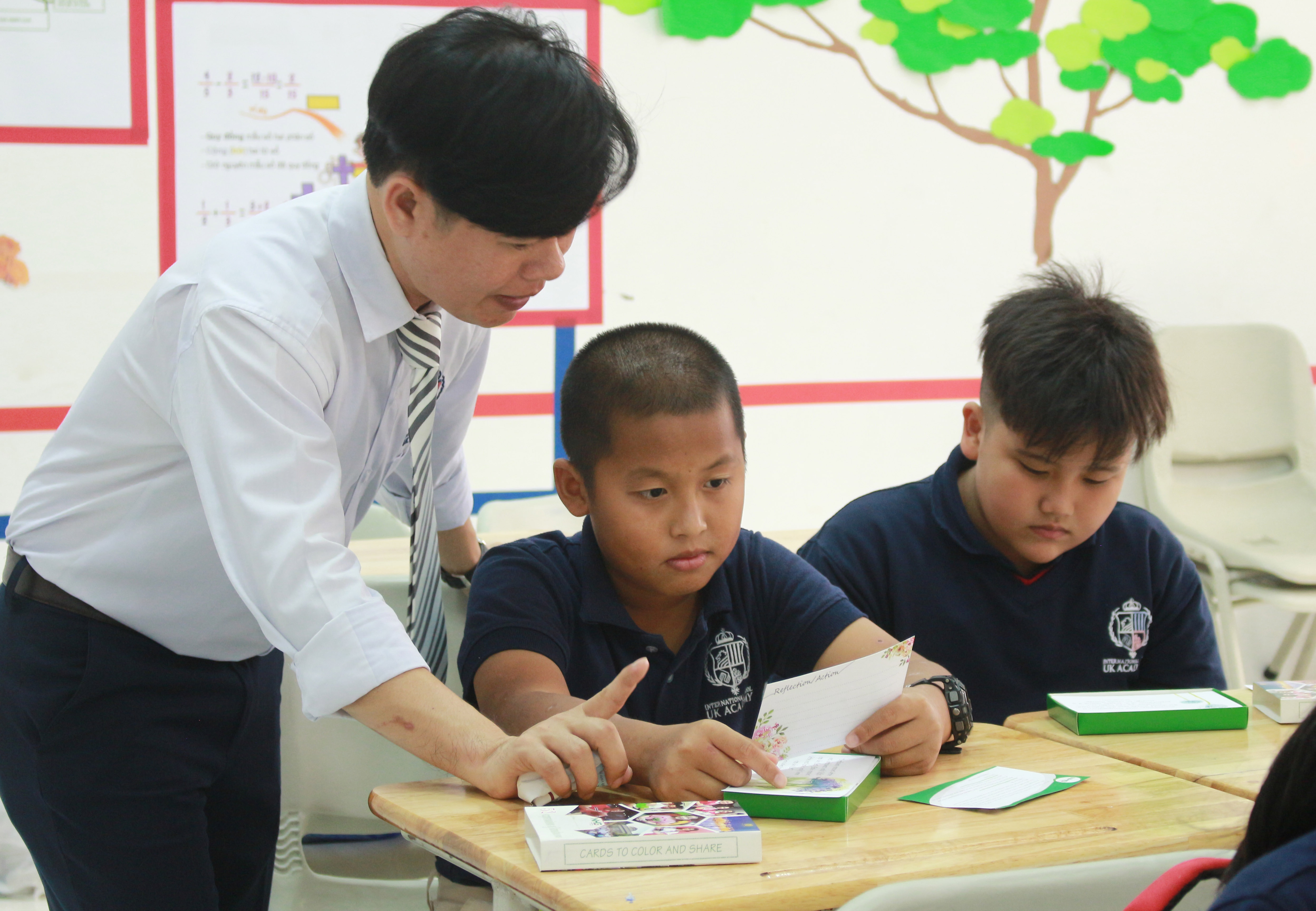 Thầy giáo Trường quốc tế song ngữ Học viện Anh Quốc UK Academy giải thích ý nghĩa danh ngôn trên những tấm card cho học sinh