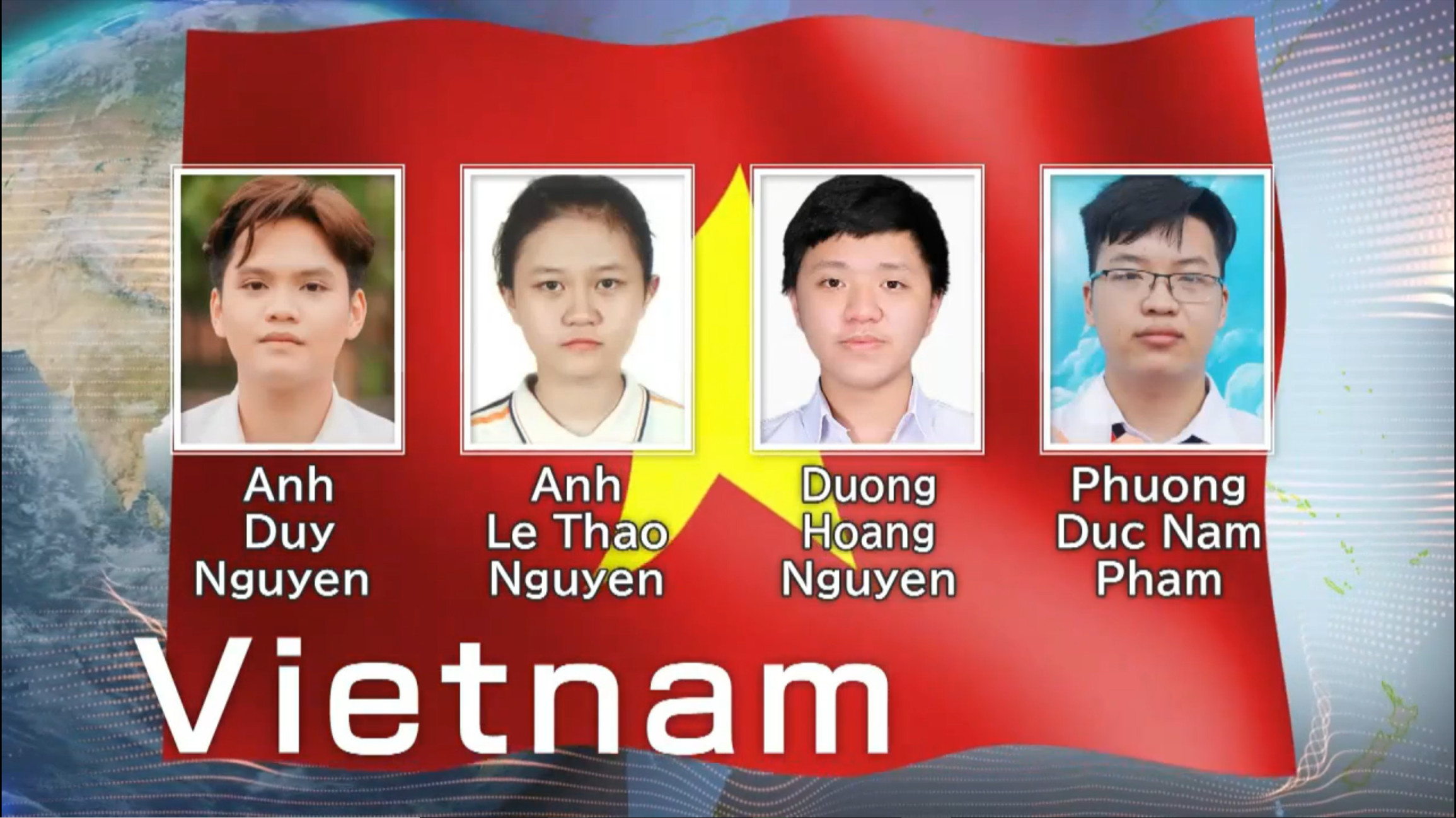 Cụ thể, Huy chương Vàng thuộc về các em: Nguyễn Duy Anh, học sinh lớp 12, Trường THPT chuyên Hà Nội Amsterdam, Hà Nội; Phạm Đức Nam Phương, học sinh lớp 12, Trường THPT chuyên Nguyễn Trãi, tỉnh Hải Dương; Nguyễn Lê Thảo Anh, học sinh lớp 12, Trường THPT chuyên Hà Nội Amsterdam, Hà Nội. Em Nguyễn Hoàng Dương, học sinh lớp 12, Trường THPT chuyên Khoa học tự nhiên, ĐH Quốc gia Hà Nội giành Huy Chương Bạc.