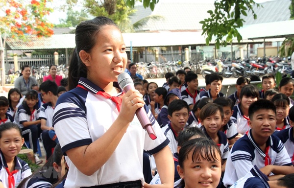Học sinh phát biểu ý kiến tại chương trình 'Giáo dục kỹ năng sống' cho gần 600 học sinh của Trường Trung học cơ sở Long Phước và Trường Tiểu học B thị trấn Long Hồ (huyện Long Hồ, tỉnh Vĩnh Long)