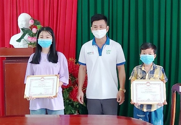 Ông Hồ Đắc Thuận, Phó Chủ tịch Ủy ban MTTQ Việt Nam huyện Phú Quốc (giữa) trao giấy khen cho 2 chị em Vônga và Hiệp