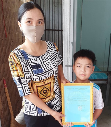 Bà Hoàng Thị Phượng, Chủ tịch Ủy ban MTTQ Việt Nam xã Kiên Bình, huyện Kiên Lương, trao thư cảm ơn em Trần Quốc Anh