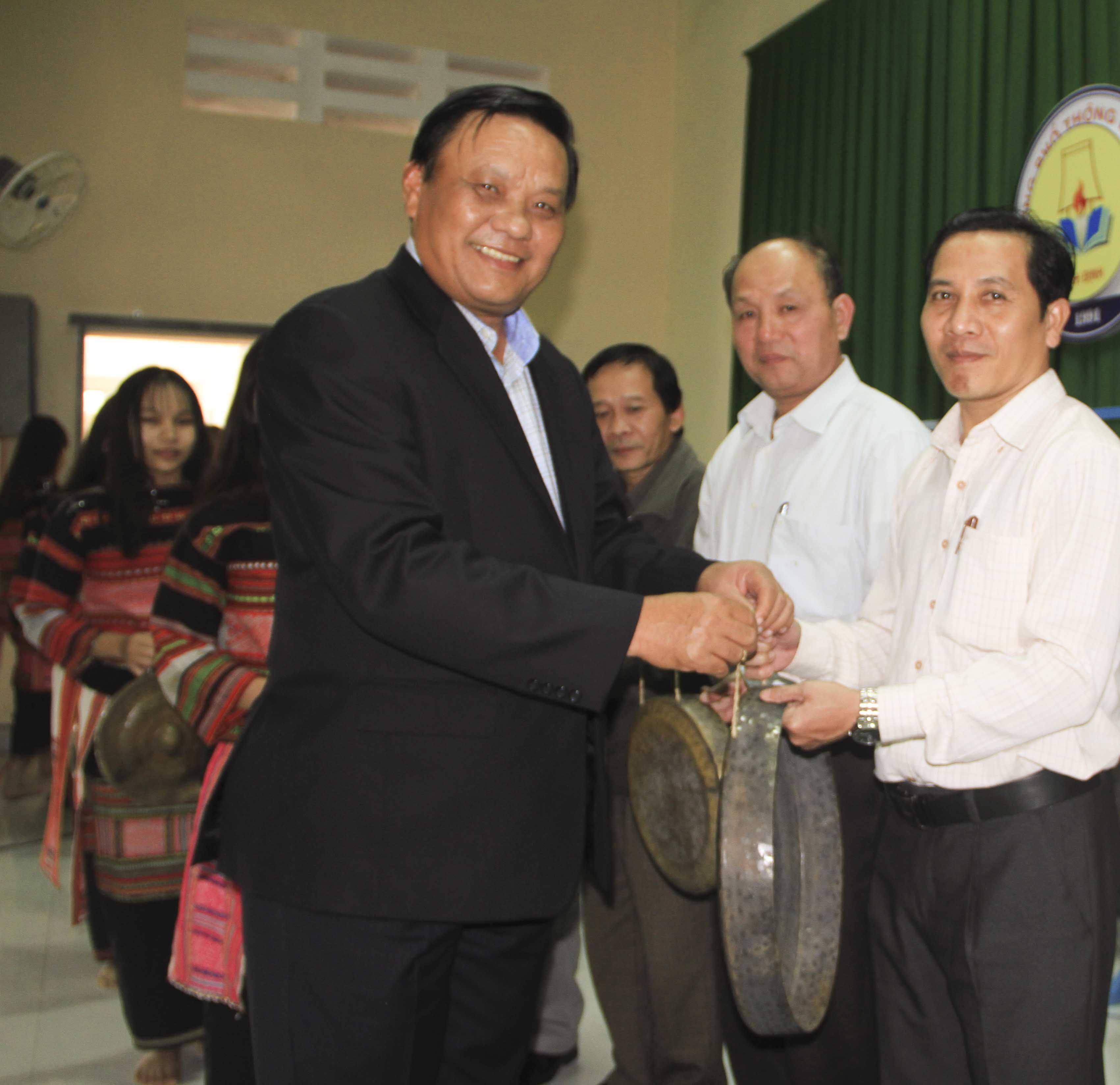 Ông Lê Kim Toàn, Phó Bí thư Thường trực Tỉnh ủy, Trưởng đoàn ĐBQH tỉnh Bình Định trao tặng bộ cồng chiêng cho các trường PTDTNT, bán trú