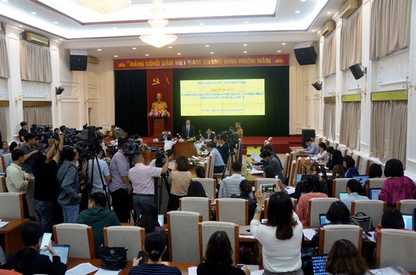 Đó là câu hỏi được nhiều phóng viên đặt ra với đại diện lãnh đạo Bộ GD&ĐT tại cuộc họp báo khi phần lớn SGK được chọn là của của NXB Giáo dục. Trước đó, Vụ trưởng Vụ Giáo dục Tiểu học Thái Văn Tài công bố Quyết định của Bộ trưởng Bộ GD&ĐT phê duyệt danh mục SGK lớp 1 sử dụng trong cơ sở giáo dục phổ thông. Theo đó, SGK là tài liệu dạy cụ thể hóa yêu cầu của chương trình giáo dục phổ thông về mục tiêu, nội dung giáo dục, yêu cầu về phẩm chất và năng lực của học sinh, định hướng về phương pháp giảng dạy và cách thức kiểm tra, đánh giá chất lượng giáo dục; nội dung và hình thức SGK không mang định kiến dân tộc, tôn giáo, nghề nghiệp, giới, lứa tuổi và địa vị xã hội; mỗi môn học có một hoặc một số SGK; thực hiện xã hội hoá việc biên soạn SGK.