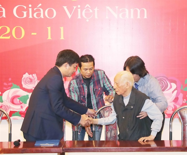 Bộ trưởng Nguyễn Ngọc Thiện chúc mừng các thầy cô Trường Đại học Sân khấu - Điện ảnh Hà Nội Ảnh: TRẦN HUẤN