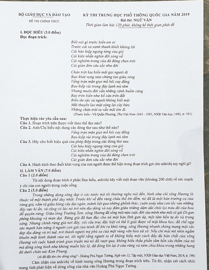 Đề thi môn Ngữ Văn kỳ thi THPT Quốc gia năm 2019