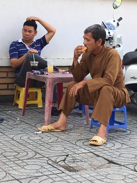 Ông Bố này trong lúc chờ con thi mang bánh mì ra ăn, bởi sáng nay đi lo cho con sớm nên chưa kịp ăn gì