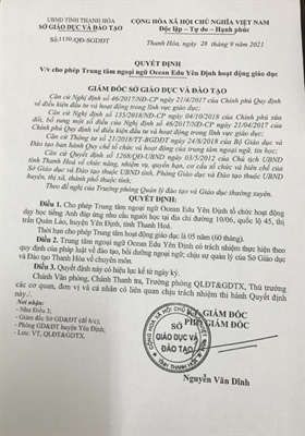 Theo Ông Dũng, việc Trung tâm ngoại ngữ Ocean Edu (Yên Định)  chưa được sở GD&ĐT cấp giấy phép hoạt động nhưng đã thực hiện tuyển sinh và thu học phí của 40 học viên là trái quy định. Thậm chí, đến ngày 23.9, Sở GD &ĐT tỉnh Thanh Hoá mới có quyết định thành lập đoàn thẩm định hồ sơ, kiểm tra các điều kiện để cấp phép hoạt động giáo dục cho Trung tâm ngoại ngữ Ocean Edu (Yên Định). Đến ngày 28.9.2021, Trung tâm này mới được Sở GD&ĐT chính thức có quyết định cho phép hoạt động.