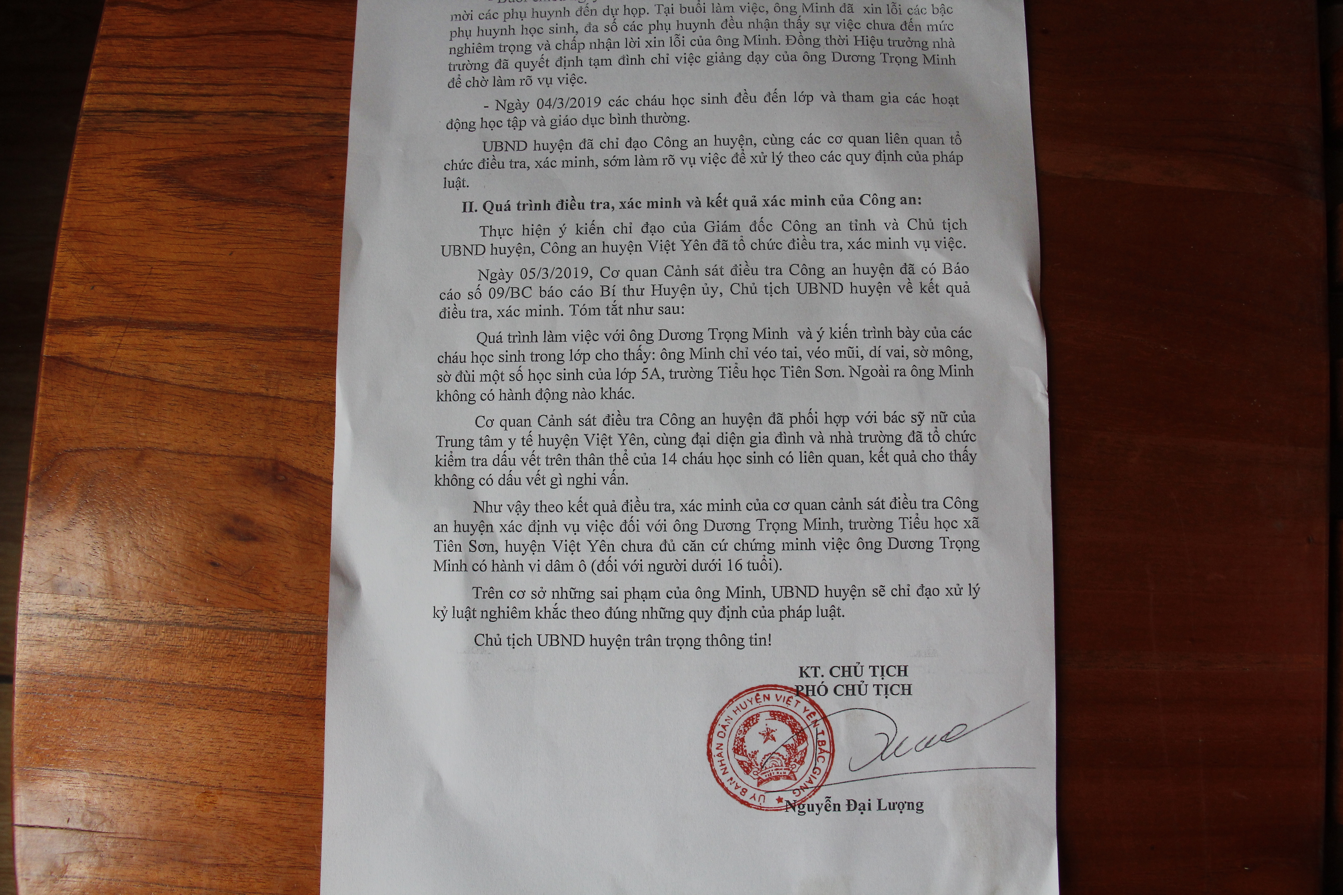Sau khi nhận được thông tin vụ việc, Cơ quan cảnh sát điều tra đã phối hợp với Trung tâm y tế huyện Việt Yên và đại diện gia đình kiểm tra dấu vết trên thân thể của 14 học sinh có liên quan. Kết quả cho thấy không có dấu vết gì nghi vấn. Do đó, cơ quan Cảnh sát điều tra kết luận chưa đủ căn cứ chứng minh việc ông Dương Trọng Minh có hành vi dâm ô đối với người dưới 16 tuổi.