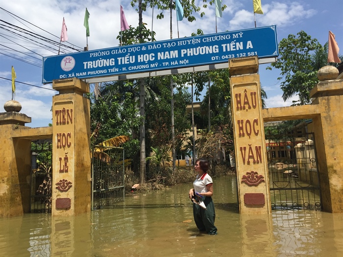 Theo kế hoạch, ngày 1.8 trẻ em tại xã Nam Phương Tiến bắt đầu quay lại trường học tập, chuẩn bị cho năm học mới. Tuy nhiên đến hôm qua 9.8, vẫn chỉ có giáo viên và các lực lượng trợ giúp như công an, cứu hỏa, đoàn viên… tập trung dọn vệ sinh phòng học chìm trong lũ nhiều ngày qua. Mực nước tại cổng các trường học vẫn ngập sâu đến đùi người lớn, trẻ em được thông báo nghỉ học ở nhà tránh lũ. Ở trường, nước rút đến đâu, các cô tích cực dọn dẹp đến đấy.