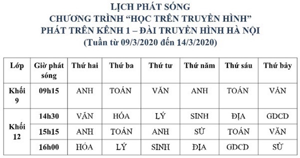 Như vậy, bắt đầu từ ngày 9.3, tại Hà Nội, các môn học phục vụ các em học sinh lớp 9 và 12 được giảng dạy qua truyền hình, trên kênh HN1 của Đài truyền hình Hà Nội. Học sinh có thể xem trực tiếp qua các chương trình truyền hình cáp của các nhà cung cấp dịch vụ lớn hoặc xem qua các ứng dụng điện thoại đi động trên nền các hệ điều hành Android hoặc IOS. Chương trình phát sóng vào 9h15, 15h15 và 16h từ thứ Hai đến thứ Bảy hằng tuần.