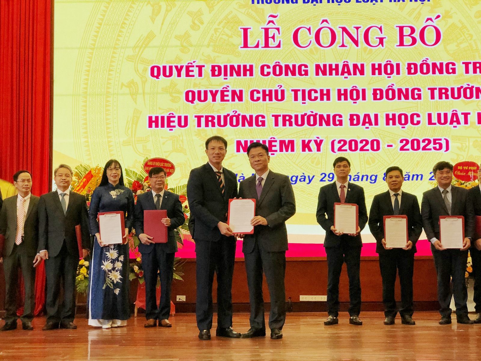 Tại buổi lễ, thay mặt lãnh đạo Bộ Tư pháp, bà Phan Thị Hồng Hà, Phó Vụ trưởng Vụ Tổ chức cán bộ, Bộ Tư pháp đã công bố Quyết định số 1737/QĐ – BTP công nhận Hội đồng trường Trường Đại học Luật Hà Nội nhiệm kỳ 2020 – 2025 và Quyết định số 1738/QĐ – BTP công nhận Quyền Chủ tịch Hội đồng trường đối với TS Chu Mạnh Hùng, Quyết định số 1779/QĐ – BTP công nhận Hiệu trưởng Trường Đại học Luật Hà Nội đối với TS Đoàn Trung Kiên.