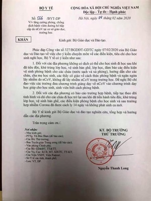 Đặc biệt, cũng tại công văn này, Bộ Y tế đề nghị Bộ GD&ĐT chỉ đạo các trường đưa nội dung về nCoV vào chương trình dạy học giúp cho học sinh, sinh viên biết cách phòng bệnh. Đối với các địa phương có báo cáo trường hợp bệnh, tiếp tục theo dõi tình hình và chỉ cho học sinh đi học trở lại sau khi đã tiến hành tiêu độc, khử trùng lớp học, vệ sinh bàn ghế, các điều kiện phòng bệnh cho học sinh và sau trường hợp nhiễm Corona đã được cách ly 14 ngày, không phát sinh ca mới. Được biết, đến thời điểm hiện tại, đã có 63/63 tỉnh, thành phố cho phép kéo dài thời gian nghỉ học của học sinh thêm ít nhất là 1 tuần tính từ ngày 10.2 để phòng, chống dịch bệnh do virus corona gây ra.