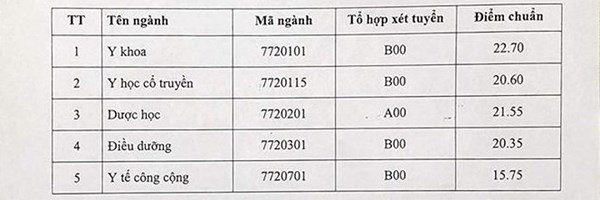 Cụ thể, ngành Y đa khoa có mức điểm chuẩn là 22,7 (năm 2017 là 27,5 điểm); ngành Dược học 21,55 điểm (năm 2017 là 26 điểm); ngành Y học cổ truyền có mức điểm chuẩn là 20,6 (năm 2017 là 25 điểm), ngành Điều dưỡng có mức điểm chuẩn là 20,35 (năm 2017 là 24,25).