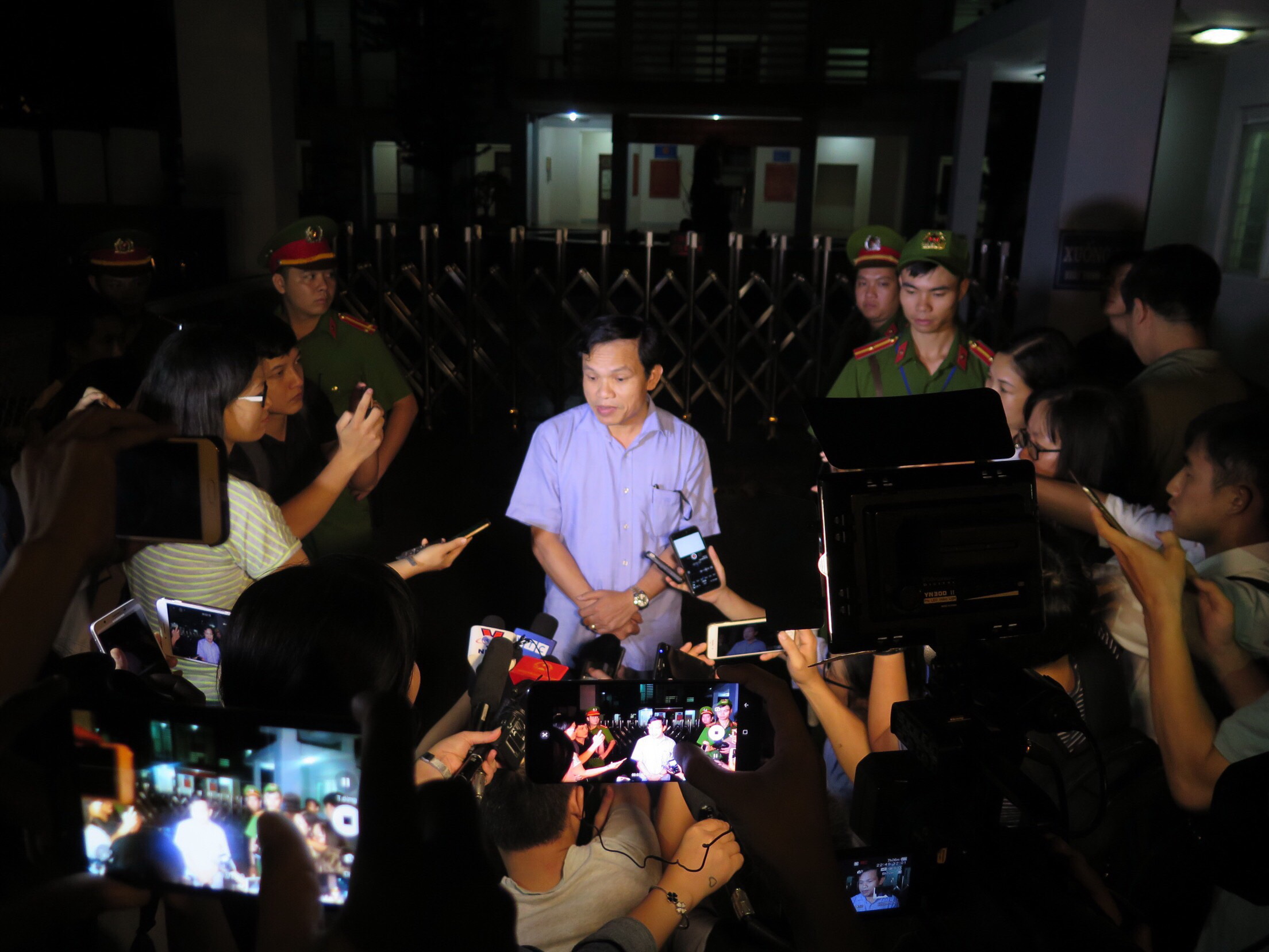 Ông Mai Văn Trinh, Cục trưởng Cục Quản lý chất lượng giáo dục, Bộ GD&ĐT gặp báo chí lúc nửa đêm tại Sơn La tháng 7.2018 Ảnh: ĐÌNH THẮNG
