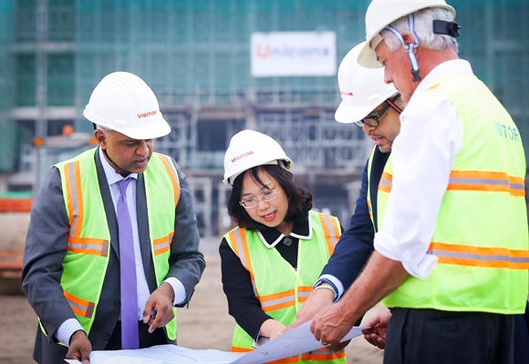 TS. Lê Mai Lan, GS. Rohit Verma cùng các Giáo sư Cornell trên công trường xây dựng trao đổi về tiến độ xây ký túc xá và khu labs trong khuôn viên Đại học VinUni.