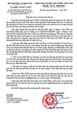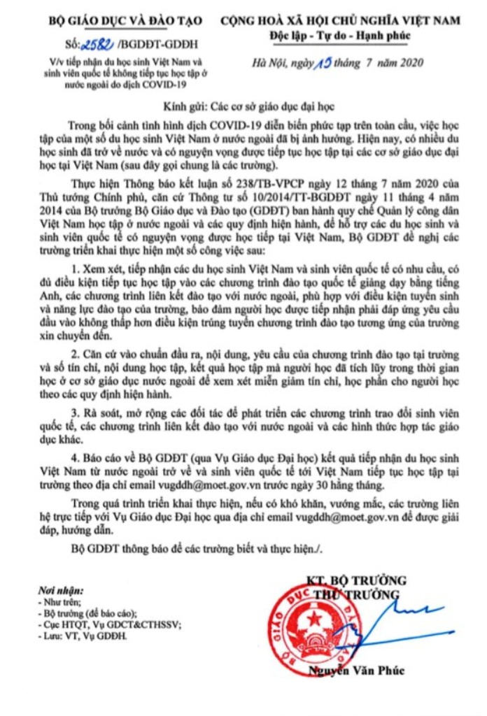 Công văn nêu rõ, trong bối cảnh tình hình dịch Covid-19 diễn biến phức tạp trên toàn cầu, việc học tập của một số du học sinh Việt Nam ở nước ngoài đã bị ảnh hưởng. Hiện nay, có nhiều du học sinh đã trở về nước và có nguyện vọng được tiếp tục học tập tại các cơ sở giáo dục đại học tại Việt Nam. Thực hiện Thông báo kết luận số 238/TB-VPCP ngày 12.7.2020 của Thủ tướng Chính phủ và các quy định hiện hành, để hỗ trợ các du học sinh và sinh viên quốc tế có nguyện vọng được học tiếp tại Việt Nam, Bộ GD&ĐT đề nghị các trường triển khai thực hiện một số công việc liên quan đến tiếp nhận du học sinh Việt Nam và sinh viên quốc tế. Các công việc đó bao gồm, xem xét, tiếp nhận các du học sinh Việt Nam và sinh viên quốc tế có nhu cầu, có đủ điều kiện tiếp tục học tập vào các chương trình đào tạo quốc tế giảng dạy bằng tiếng Anh, các chương trình liên kết đào tạo với nước ngoài.