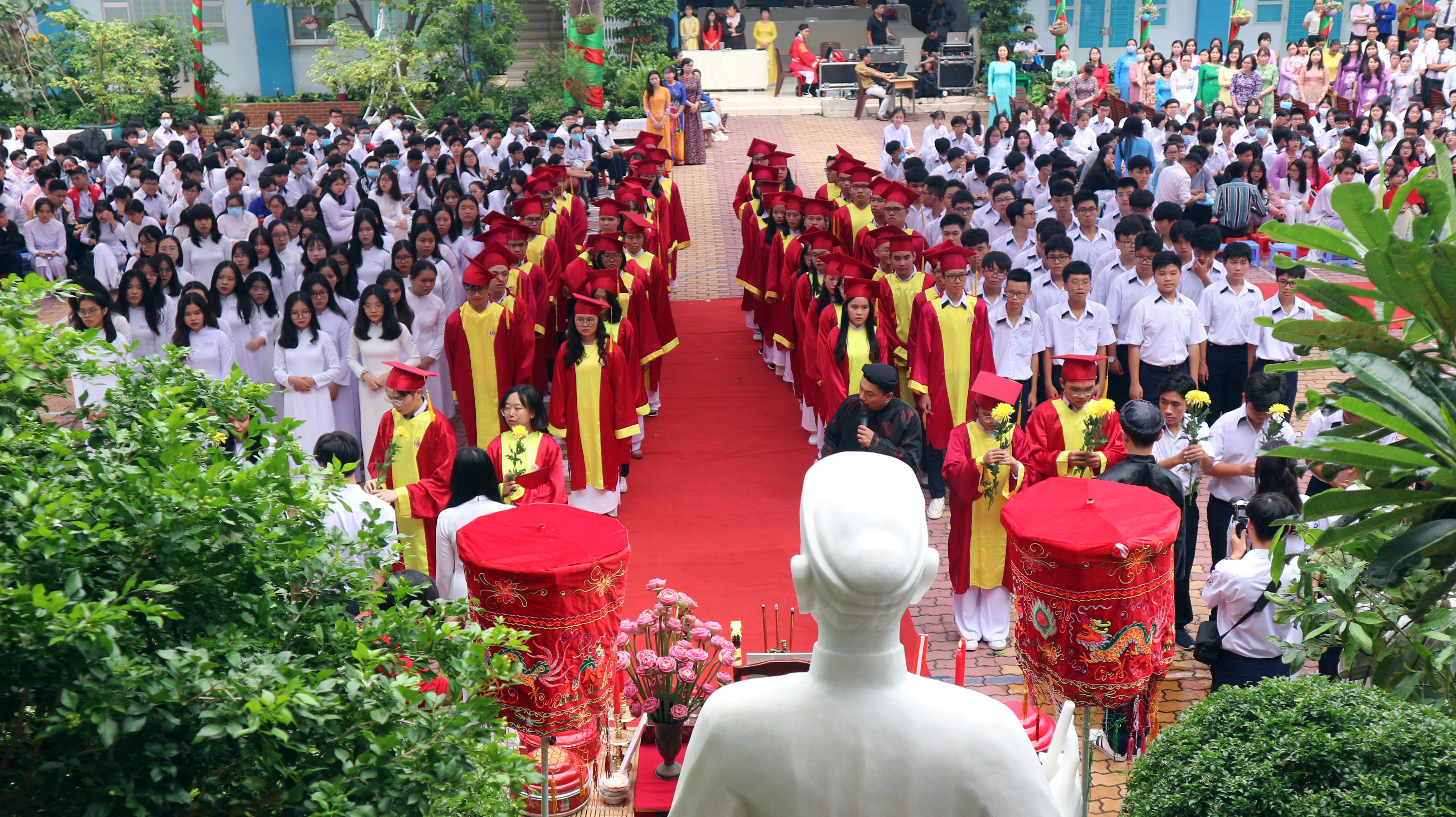 Thầy và trò Trường THPT Nguyễn Du thực hiện nghi thức dâng hương, dâng hoa tại bàn thờ và tượng Nguyễn Du trong khuôn viên nhà trường