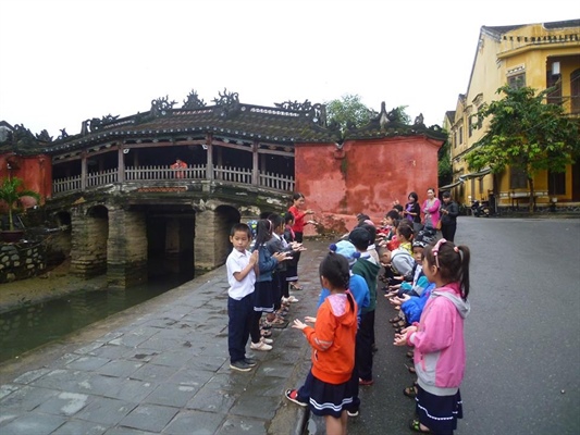 Các em học sinh tiểu học khám phá di tích Chùa Cầu tại tiết học “Giáo dục di sản học đường”