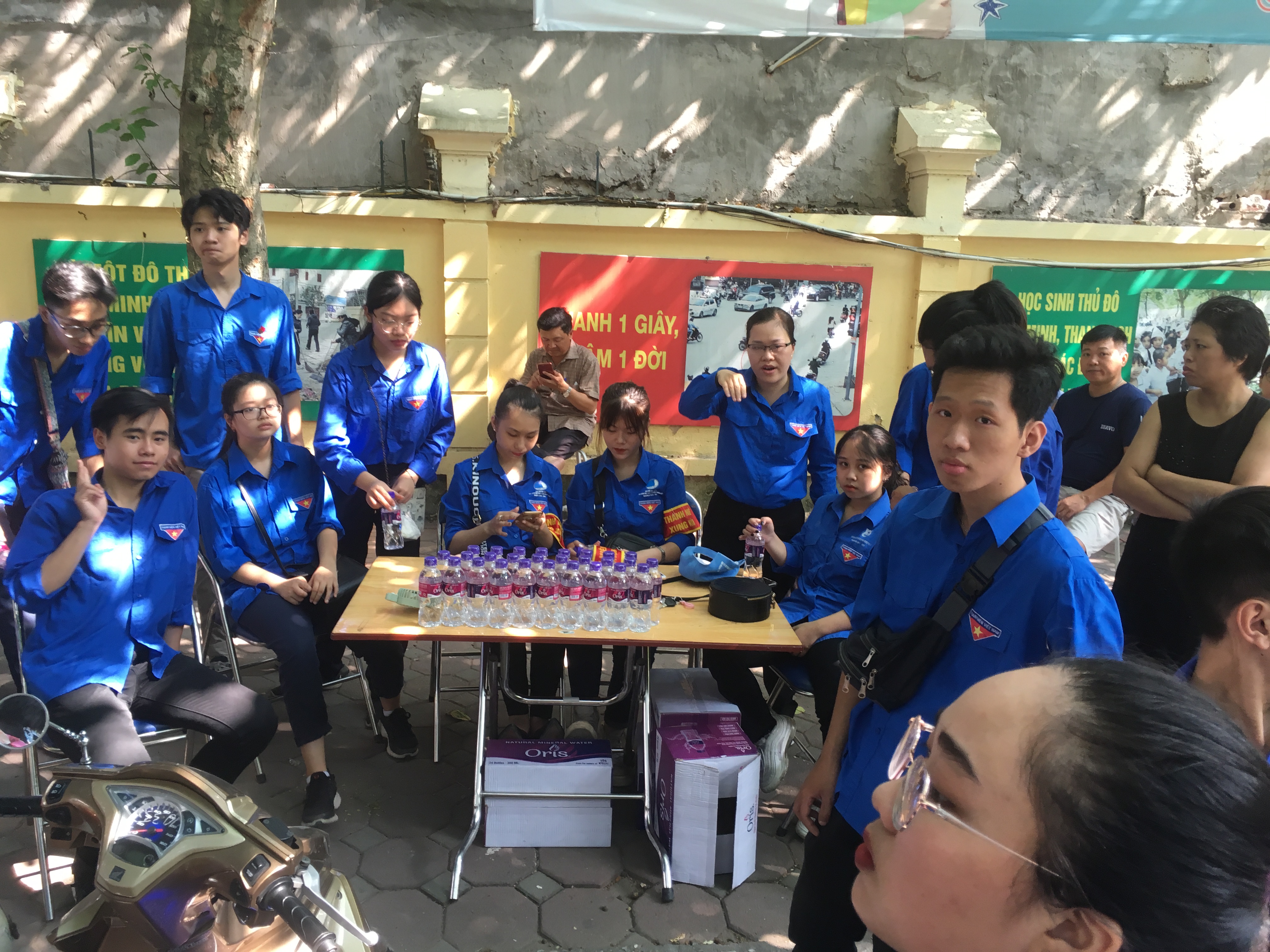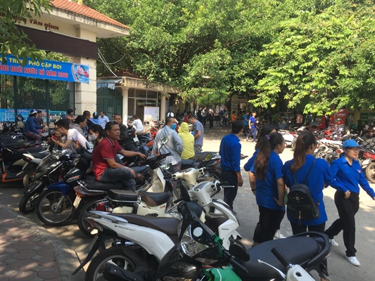 Phụ huynh chờ đợi con em tại điểm thi THCS Tân Định- Hoàng Mai sáng 16.7