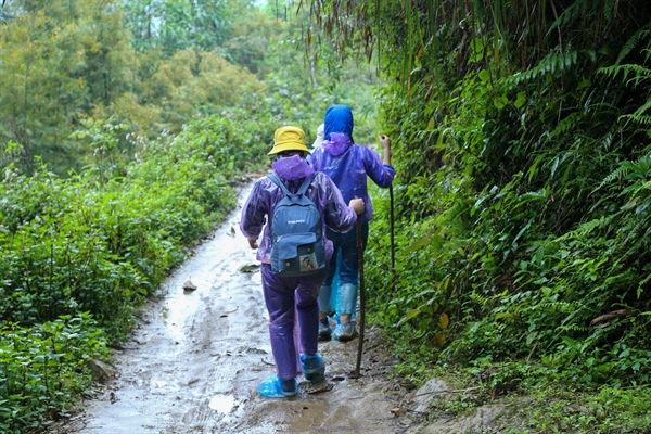 Cô giáo Hà Thị Tuyết cùng đồng nghiệp băng rừng đến lớp. Ảnh: Vũ Mừng