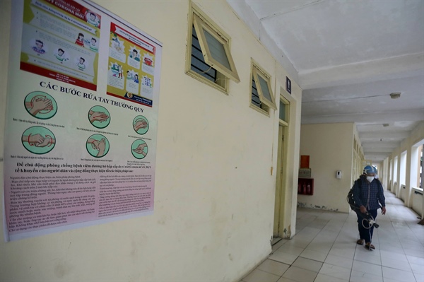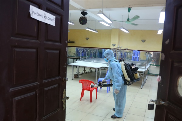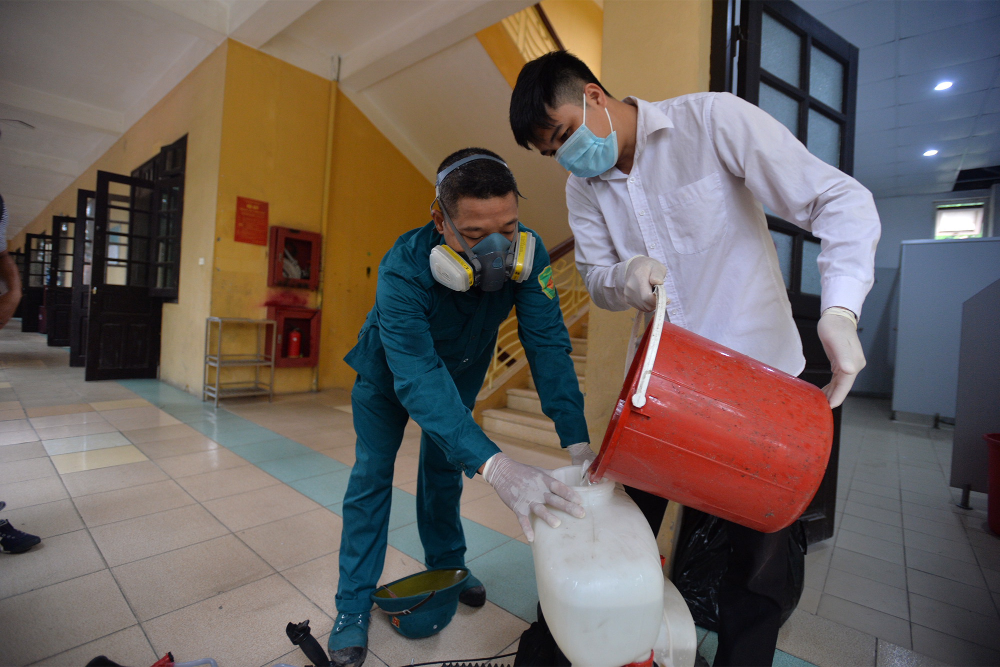 Bên cạnh việc phun khử khuẩn, công việc vệ sinh, lau chùi sạch sẽ phòng thi bằng dung dịch khử trùng.