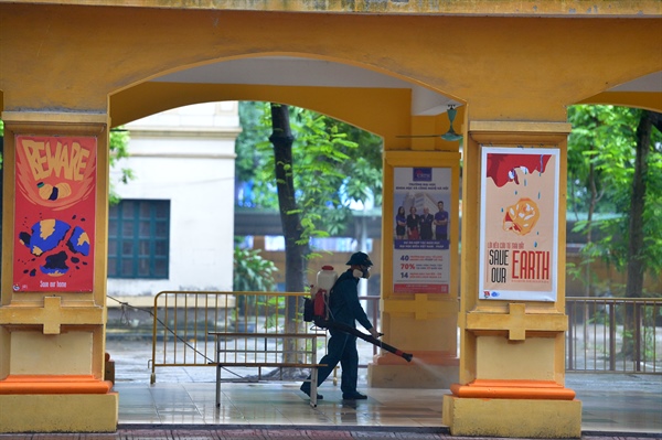 Công tác phun thuốc diễn ra tại trường THPT Kim Liên, Q Đống Đa được thực hiện bên ngoài sân trường.
