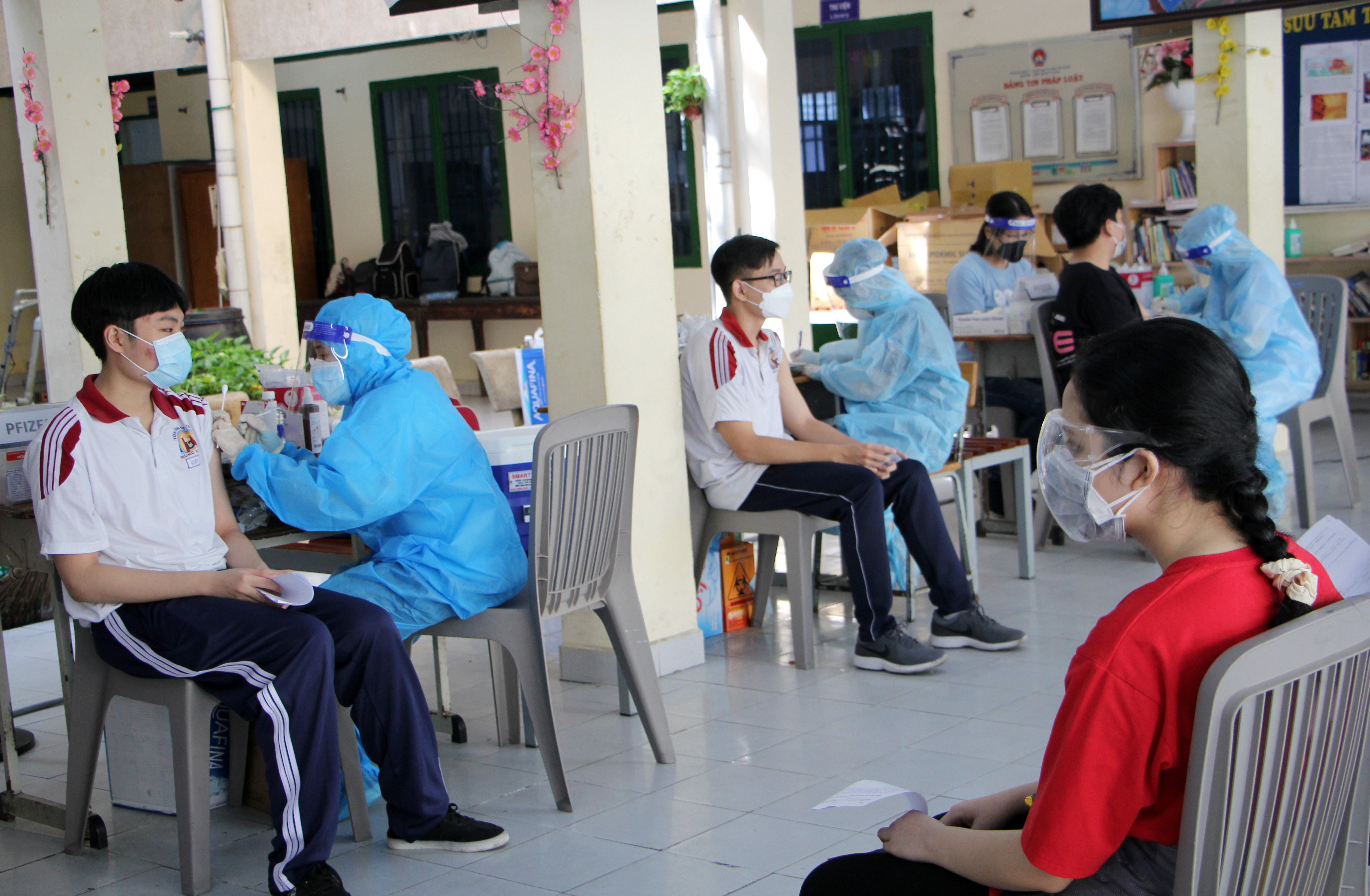 Tiêm vắc xin cho học sinh lớp 12 tại điểm tiêm Trường THPT Hùng Vương, TP.HCM