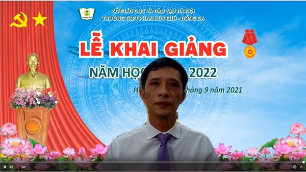 Thầy Hà Xuân Nhâm – Hiệu trưởng Trường THPT Phan Huy Chú phát biểu tại Lễ Khai giảng trực tuyến của Trường
