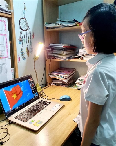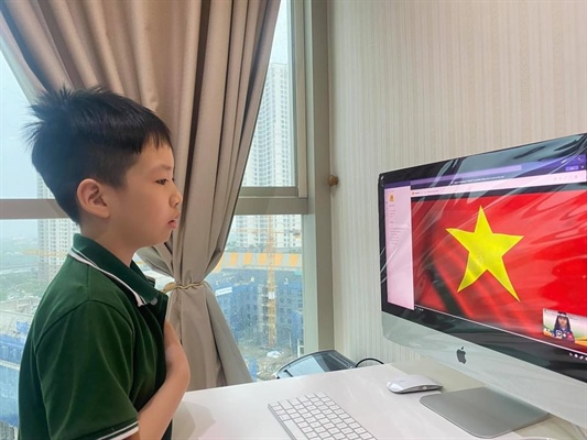Các học sinh trang nghiêm chào cờ tại Lễ Khai giảng trực tuyến năm học 2021-2022
