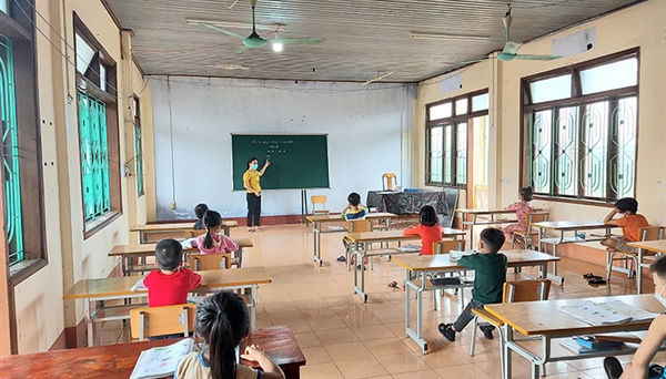 Lớp học được tổ chức tại khu cách ly cho các em học sinh lớp 1
