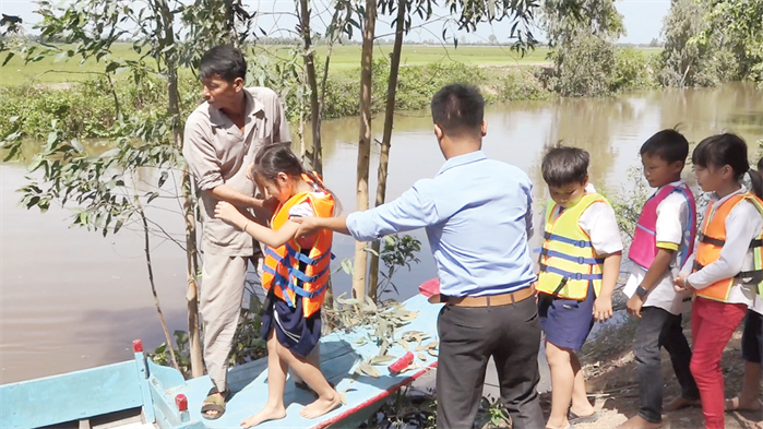 Em Nguyễn Thị Minh Thư, học sinh lớp 4 Trường tiểu học Bình Giang 1, xã Bình Giang, huyện Hòn Đất nói: “Đường từ nhà em đến trường gần 3 km hiện nước ngập sâu em không đạp xe đi học được. Hơn 1 tuần qua em được các thầy cô đưa đón, em rất vui! Mặc dù em biết bơi nhưng nước lên cao, chảy rất siết nên khi đi vỏ đò đến trường em phải mặc áo phao để phòng tránh đuối nước”.