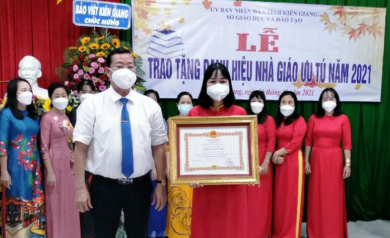 Ông Trần Quang Bảo, Giám đốc Sở GDĐT Kiên Giang trao danh hiệu cho cô giáo Đoàn Thị Hạnh, giáo viên Trường Tiểu học thị trấn Hòn Đất 1, huyện Hòn Đất ngày 16.11.2021