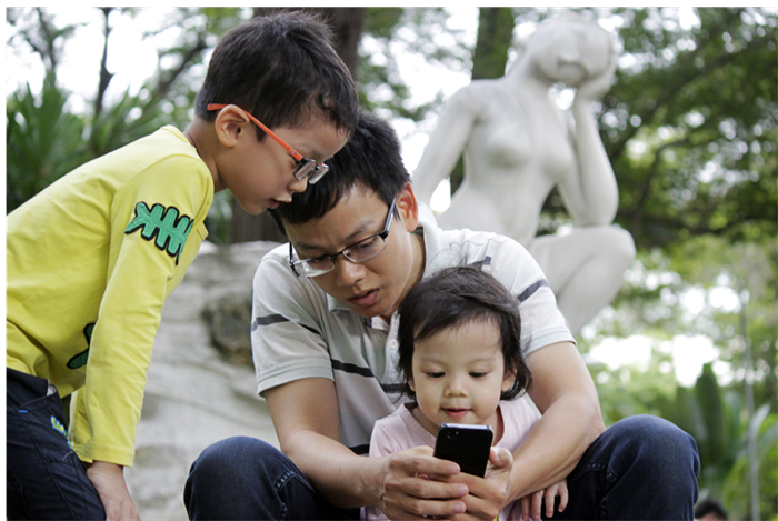 Phụ huynh đang hướng dẫn cho con trẻ chơi trò PokemonGo Ảnh: N.L.Đ
